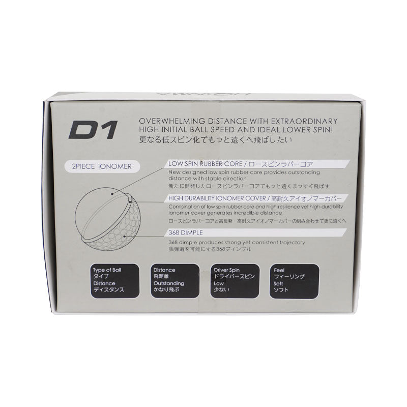 - Konstruksi Ionomer dua lapis pada bola golf D1 memberikan jarak dan rasa yang luar biasa bagi pemain dengan kecepatan kepala stik di bawah 90 mph. Dilengkapi konstruksi 2 bagian368